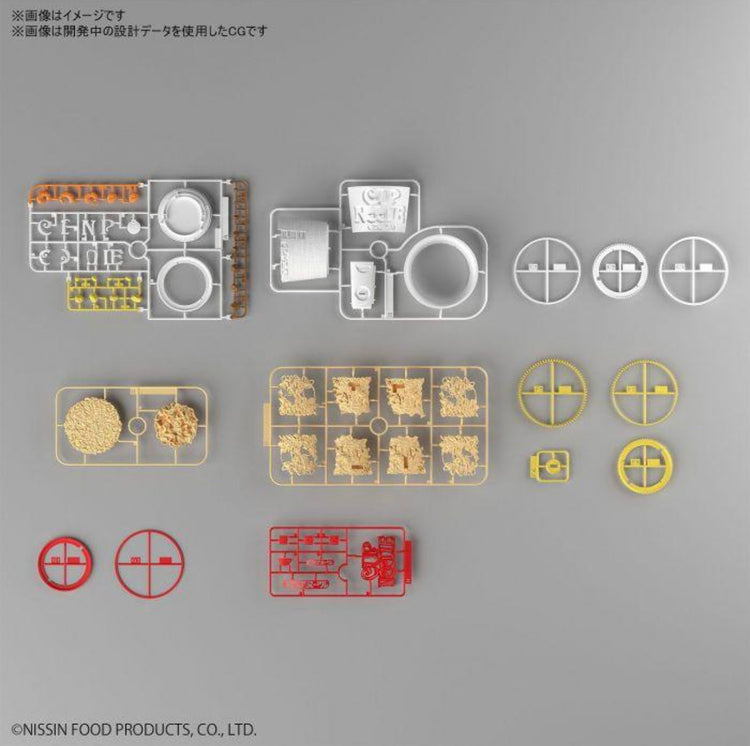 Here's one Cup Noodle that won't be ready in just three minutes! Bandai subjected a real Cup Noodle to 3D scanning to realistically reproduce the dense, intricate noodle mass inside that familiar styrofoam cup, and the egg bits, shrimp and "mysterious meat" (yes, that's what Bandai calls it!) were also 3D scanned and are precisely designed as individual parts. The green onion flakes are cut out of vinyl material, and you can add them as you like. The Cup Noodle logo and designs on the cup are separated by color for a multi-layered structure and an incredibly accurate appearance. The molded-in caution notes, ingredient notes, allergy notes, and preparation instructions are all there, too. A sticker for recreating the lid is also included, and it can be attached and removed as you like; a lid stop sticker is also included. Assemble and display this iconic piece of Japanese culture with pride.