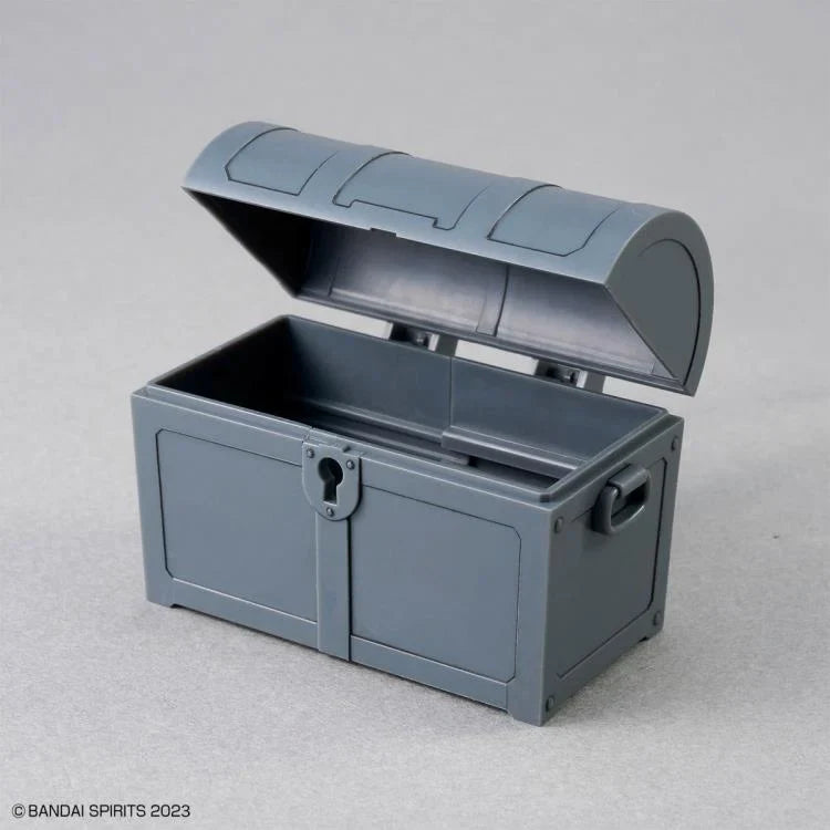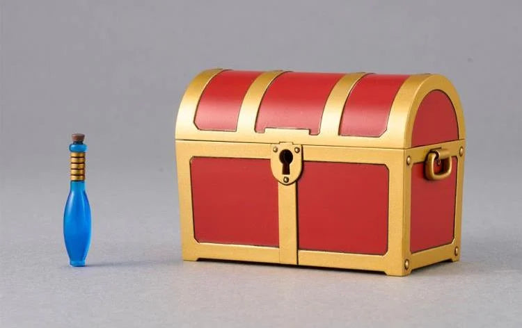 A set full of weapons and items that expand the range of customization! Face, shoulder, and chest armor parts come with two different designs. Treasure Chest and Potion come in two types: gray and clear blue. The lid of the Treasure Chest can be opened and closed.