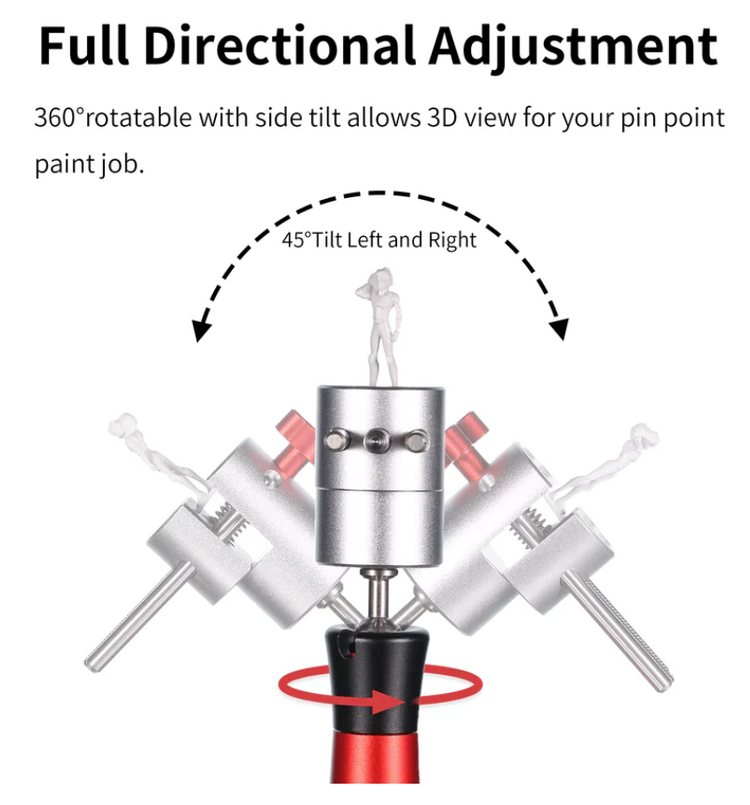 The 90 degree slot on the ball locking mechanism allows up to 90 degree tilted fixture of part for ease of painting bottom section of your model.