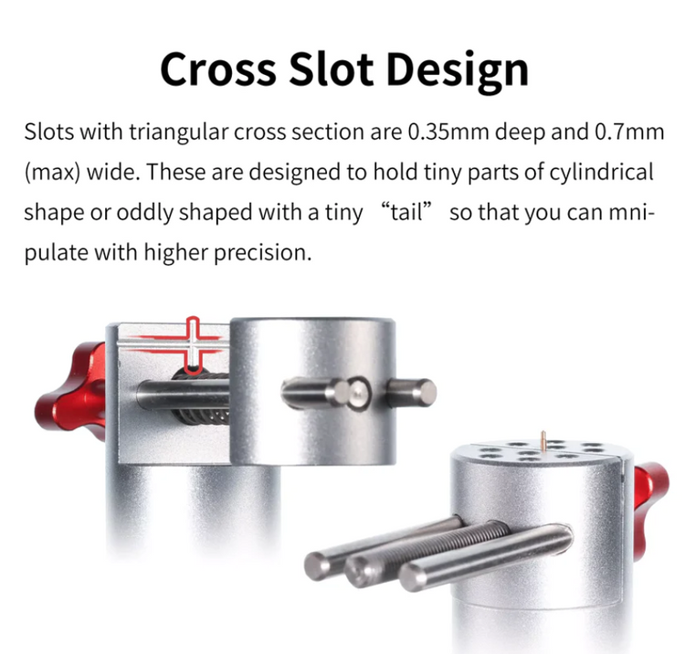 Slots with triangular cross section are 0.35mm deep and 0.7mm (max) wide. These are designed to hold tiny parts of cylindrical shape or are oddly shaped with a tiny "tail" so that you can manipulate with higher precision