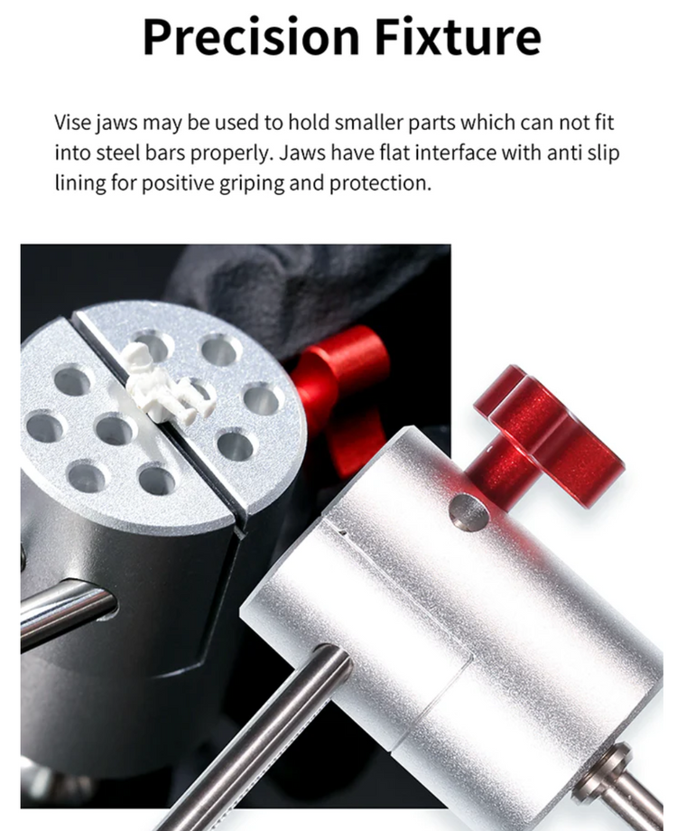 CNC machined with 0.002cm tolerance, double guide rail design for ultimate precision fixture, silicon rubber tubing protects parts from scratching