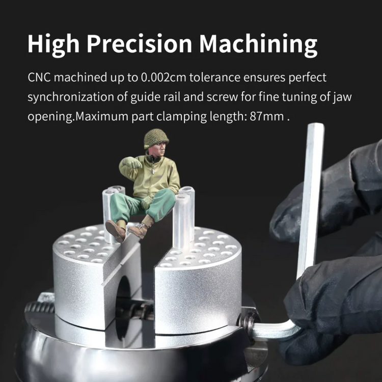 - CNC machined up to 0.002cm tolerance ensures perfect synchronization of guidfe rail and screw for fine tuning of jaw opening.