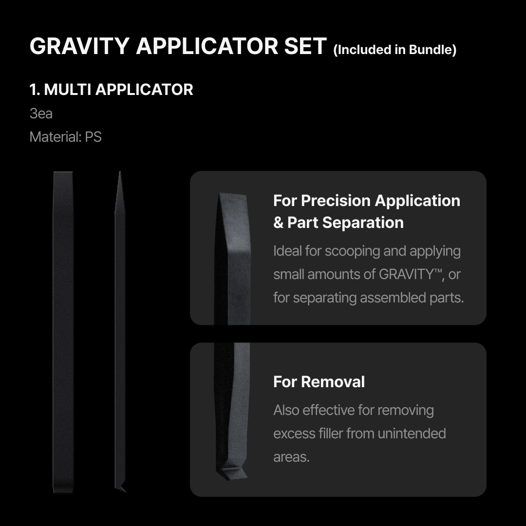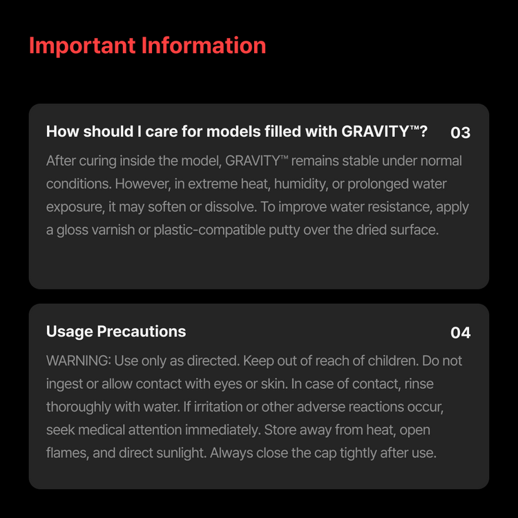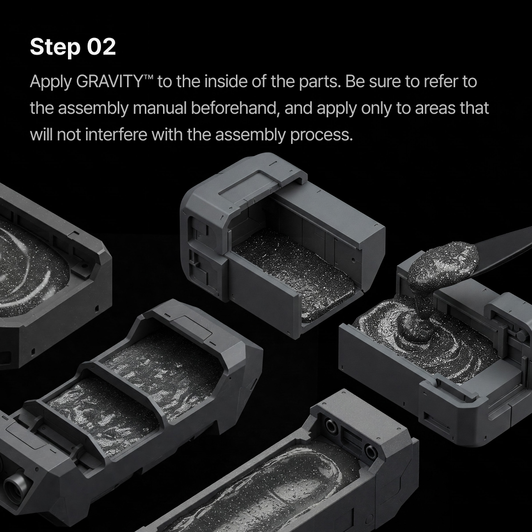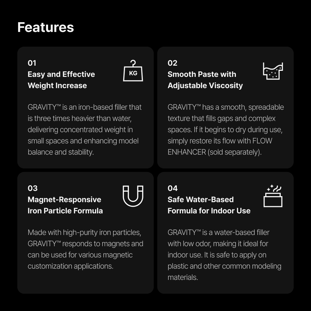 GRAVITY™ is an internal filler engineered to add weight to lightweight plastic models. Applied inside the model, it helps increase mass, improve balance, and enhance overall stability. Made with high-purity iron particles, it delivers substantial weight even in small quantities.