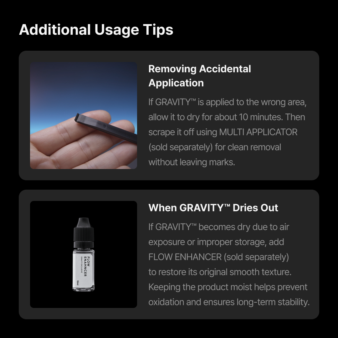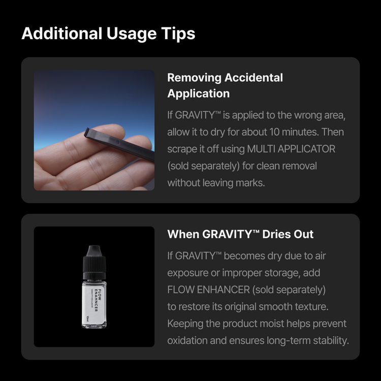 GRAVITY™ has a smooth, spreadable texture that fills gaps and complex spaces. If it begins to dry during use, simply restore its flow with FLOW ENHANCER (sold separately).