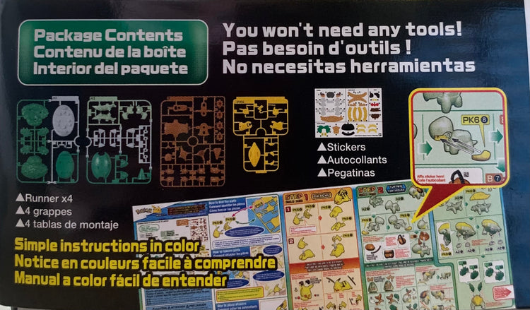 This simple snap-fit plastic kit set allows modelers to build Pikachu and three evolution forms of Torterra, consisting of Turtwig, Grotle, and Torterra, All parts come molded in color and a sheet of stickers is provided for detail so no painting is required.