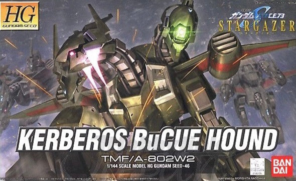 Fantastic HG kit of Kerberos BuCUE Hound, as seen in the "Gundam Seed Stargazer" Original Net Animation series mutilating Blu Duel Gundam, is basically an upgraded version of the original BuCUE with a black paint scheme and a Kerberos Wizard backpack