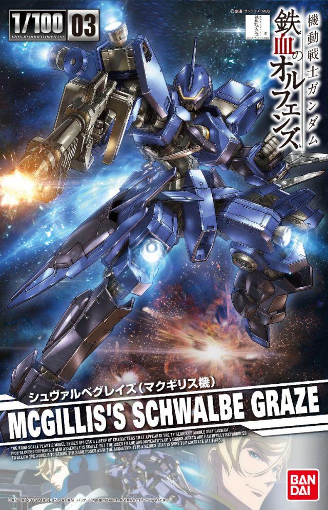 McGillis Fareed’s custom Schwalbe Graze from the hit series “Mobile Suit Gundam: Iron-Blooded Orphans” is now available in 1/100 scale! While this kit may not carry the “Master Grade” label it’s definitely not lacking in detail! A full inner frame with excellent articulation makes this a kit that can’t be missed! Parts come molded in multiple colors with a small foil sticker sheet included to add some extra details and colors. Also just like the 1/100 scale Graze Normal type release this kit comes with some extra parts to add to and customize the 1/100 scale Barbatos! Scale: 1/100 Item Size/Weight: 31.0cm x 20.0cm x 11.2cm / 510g Release Date: Jan 2016