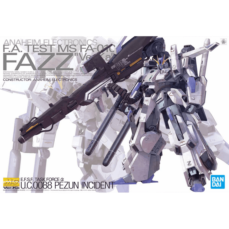 Under the supervision of Hajime Katoki, the FAZZ features new proportional armament and armor interpretations as well as various sliding gimmicks. The forearm has been designed with a unique movable roll to achieve a wide range of movement. When the arm is raised horizontally, it is structured to move in conjunction so that the additional armor does not interfere. When raising the legs, additional armor of the front armor is deployed upwards to avoid the parts rubbing.