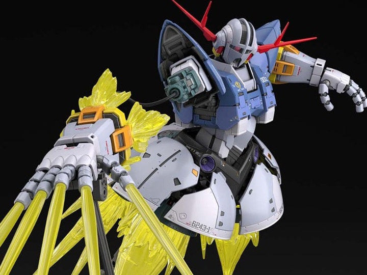 Because of this many dynamic poses are capable of being achieved including thruster deploying gimmics in the chest and back that open with torso movement. Insert molded joints are used in the hands of the Zeong allowing for intricate movable finger Mega-Particle Cannons, which can also be displayed with included wires for recreating its all range attacks. The mono eye moves with rotation of the head and can also be moved vertical manually