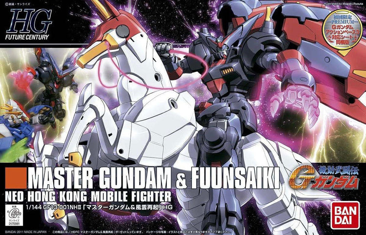 Based on Mobile Fighter G Gundam, the Master Gundam and Fuunsaiki model kit is in 1/144 scale and become fully articulated figures once complete. The Master Gundam can be posed in normal and attack modes and can ride on the Fuunsaiki model.