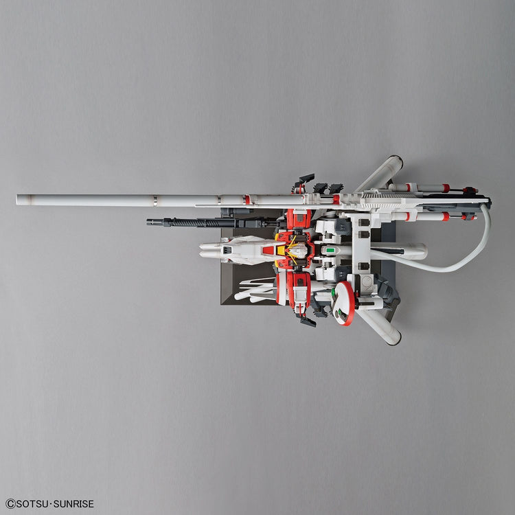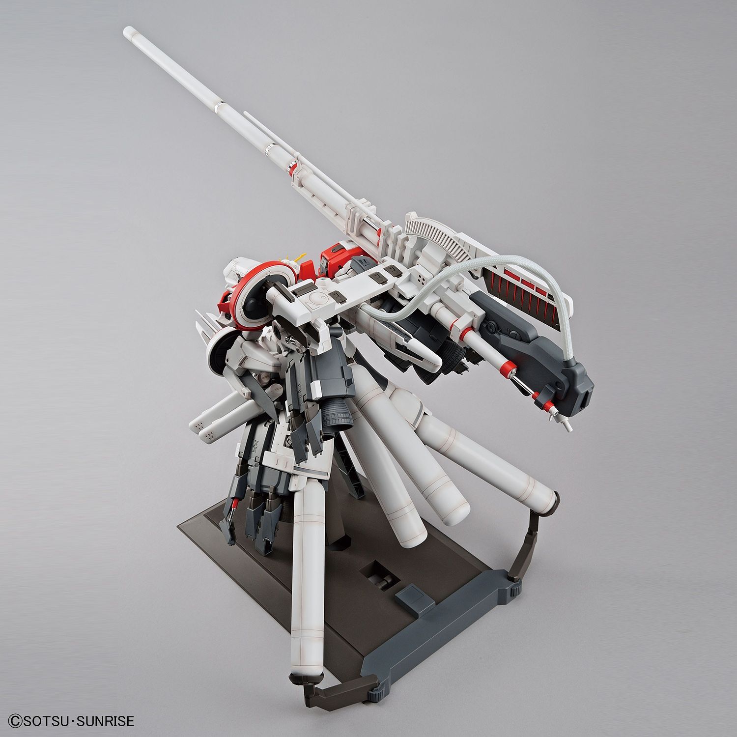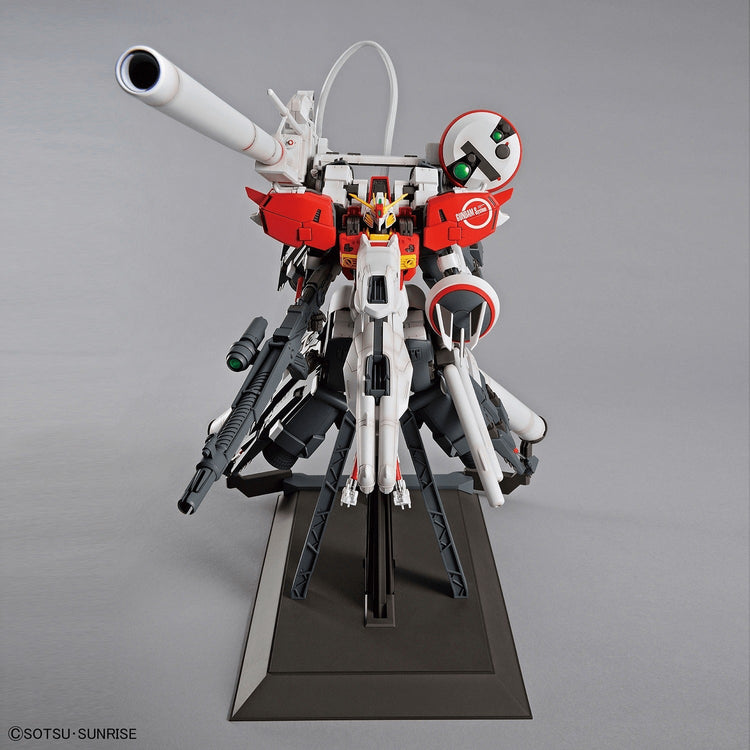 Over 21" long, this behemoth machine features a massive main gun unit, large radome, I-Field generator and giant boosters and propellant tanks covering its body. New molding is used for the bulk of construction including new pieces for the S Gundam's chest plate, the head, and shoulders that streamline its shoulder to head proportion, and even includes the shoulder sliding gimmick not seen on the original MG S Gundam release. A sense of realism and heft are created through mesh piping, chromed pistons, and intricate part separation in the main gun unit and tail stabilizer sections. A display stand is included to hold the Deep Striker in all its glory