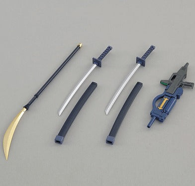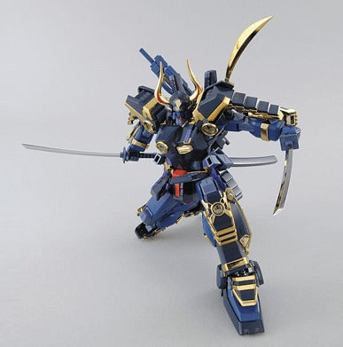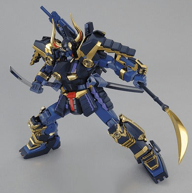 This design of Musha Gundam MK-II is featured in the Dynasty Warriors Gundam video game series and features gold stylized markings all over its body and Japanese themed weapons, including: two Kotetsu Maru swords, the Shoruy Maru gun and the Senkou Maru Naginata.
