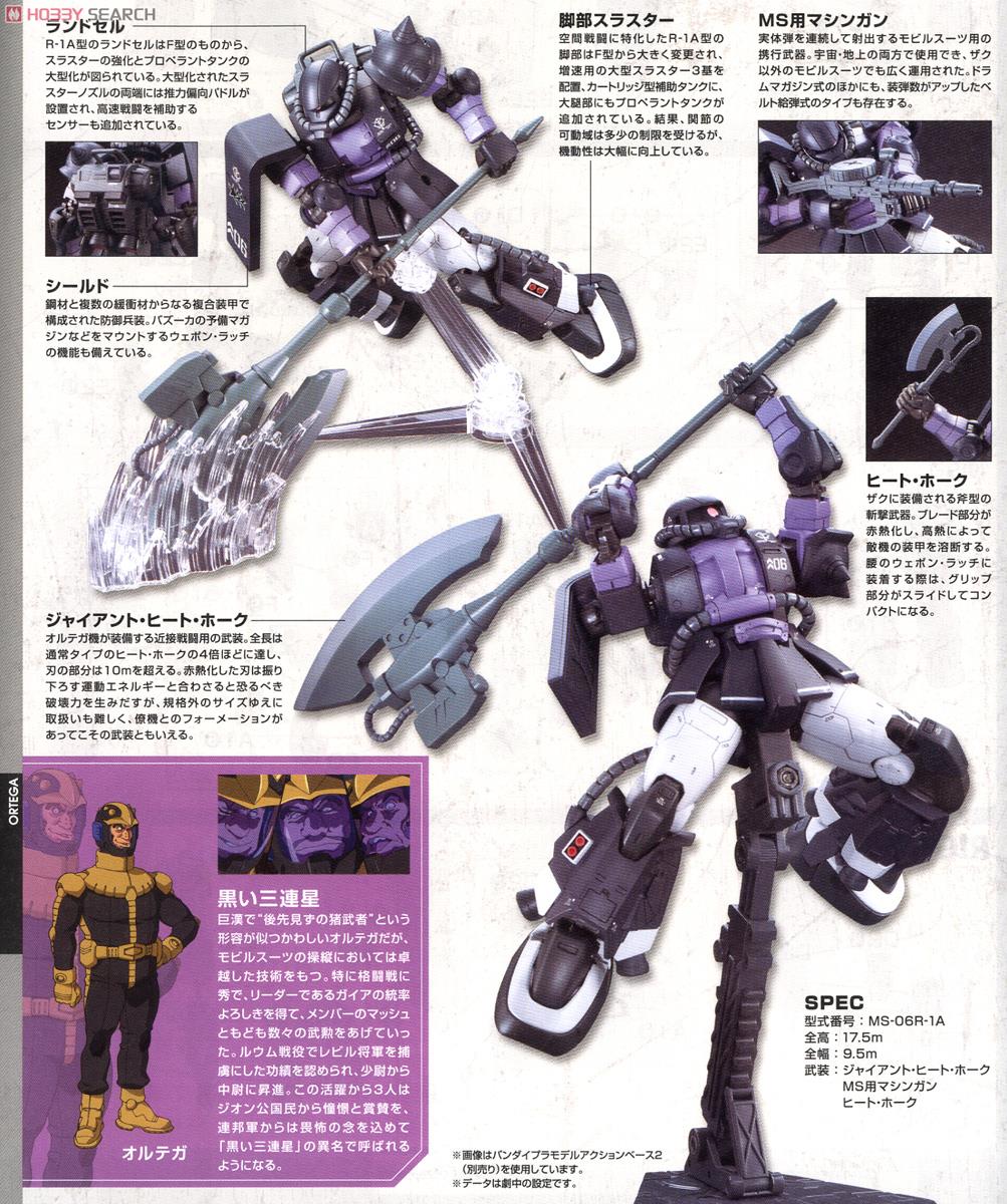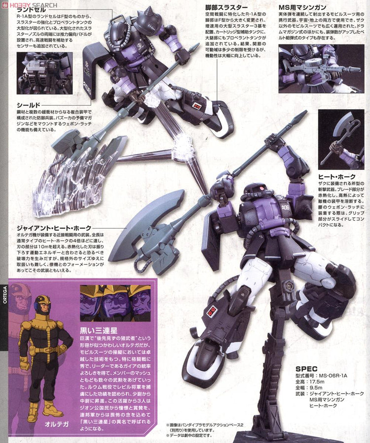 Finally `Following the black tertiary star` Soroibumi high mobility type Zaku II (Gaia / mash machine), Ortega machine appeared! - High Mobility type Zaku II Ortega machine HG of. Reproduce the distinctive giant Heat Hawk along with the effects pedestal. - Clear parts made of the effect base and dedicated stand is included. Giant in the play to wield the heat Hawk can pose with the same dynamism. - Comes with Tetoron seal to reproduce the marking of the distinctive black triple stars. - Heat Hawk (storage and deployment), machine gun for MS, a giant heat Hawk included. Accessories: Heat Hawk (development and housing), machine gun for MS, Giant Heat Hawk, effects pedestal Scale: 1/144 Item Size/Weight: 29.6cm x 18.4cm x 9.6cm / 420g Release Date: Sep 2015