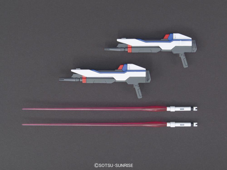 An updated design of the Strike Freedom from "Gundam Seed Destiny" recreated with new proportion and part separation technology. Includes 2 beam rifles that can also combine, hip mounted rail guns that can fold back for storage, beam shield, and 2 beam sabers.
