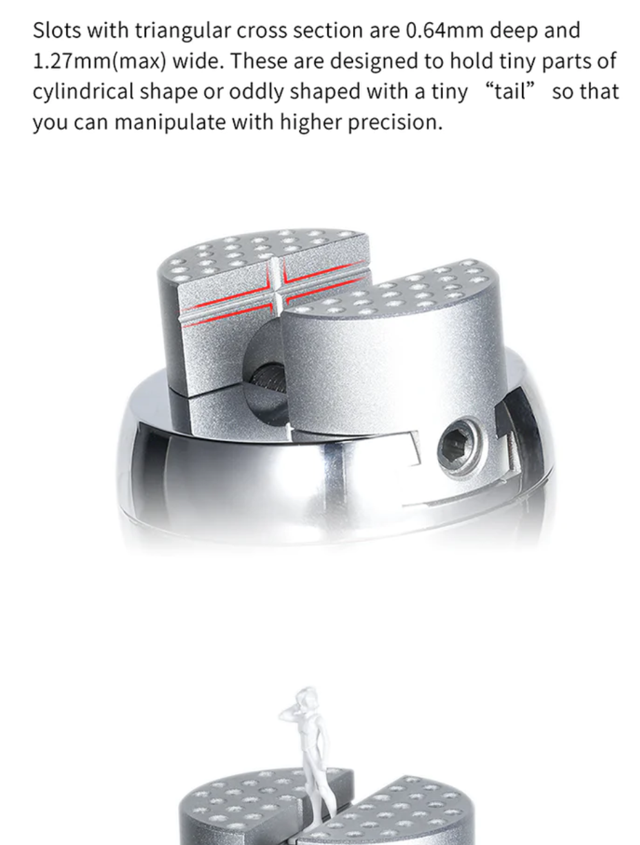 - Slots with a triangular cross section are 0.64mm deep and 1.27mm (max) wide. These are designed to hold tiny parts of cylindrical shape or oddly shaped with a tiny "tail" so that you can manipulate with higher precision.