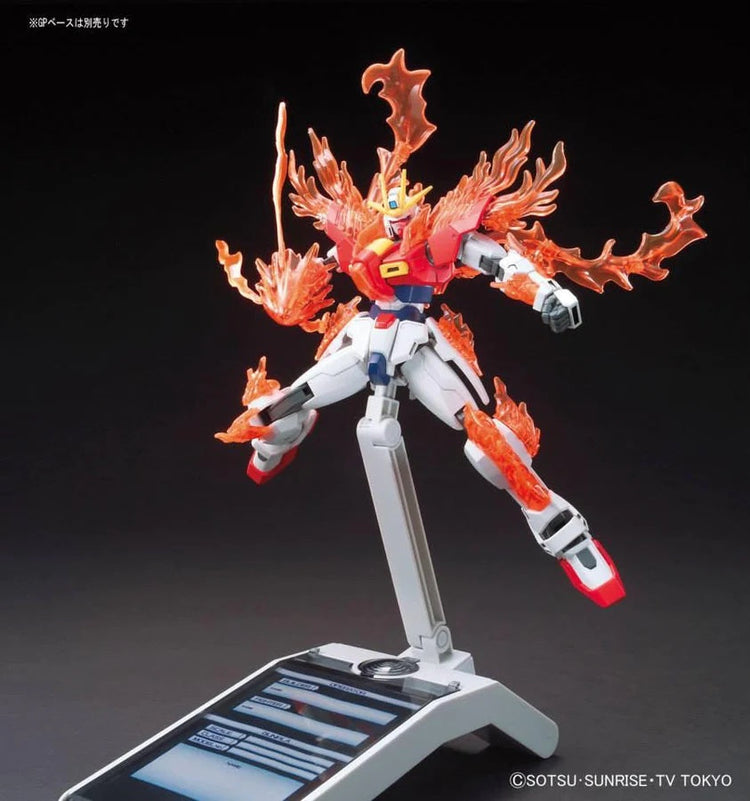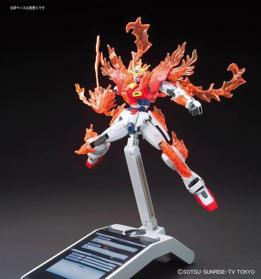 The Try Burning Gundam from Gundam Build Fighters Try is ready for battle! In addition to an array of weapons, Try Burning Gundam includes the fiery punch, kick, back, and flame effect parts as well as four different types of hands showcasing martial arts gestures.