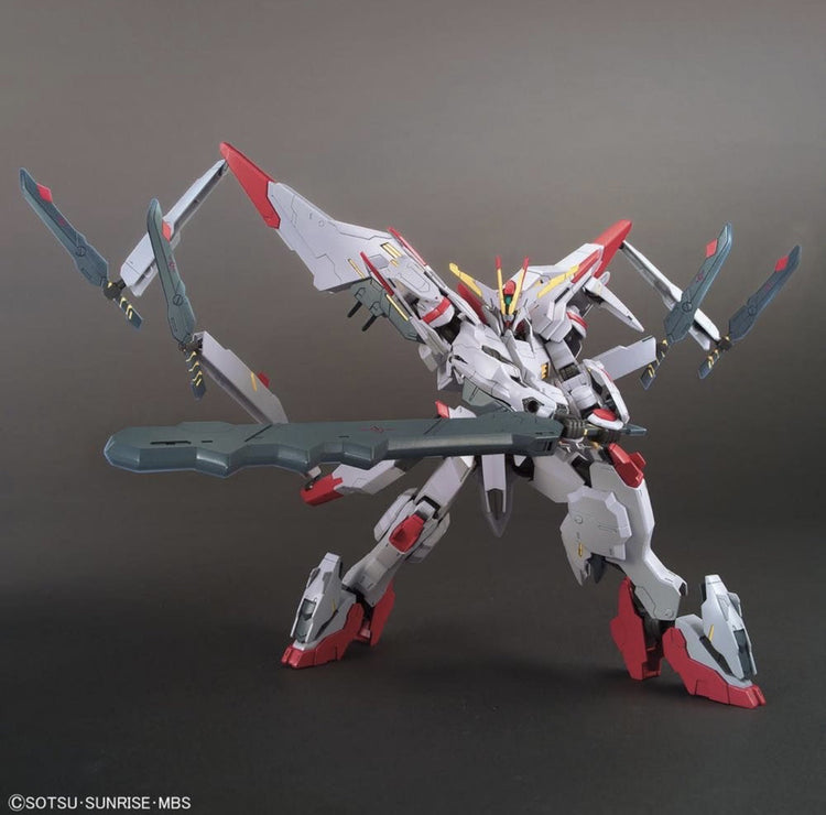 Thought to be lost during the Calamity War in Mobile Suit Gunda Iron-Blooded Orphans, this machine was unaccounted for among the 26 remaining MS, and features a distinct shape—due to its back and waist-binder set up with sub-arms designed to fight non-humanoid Mobile Armors.